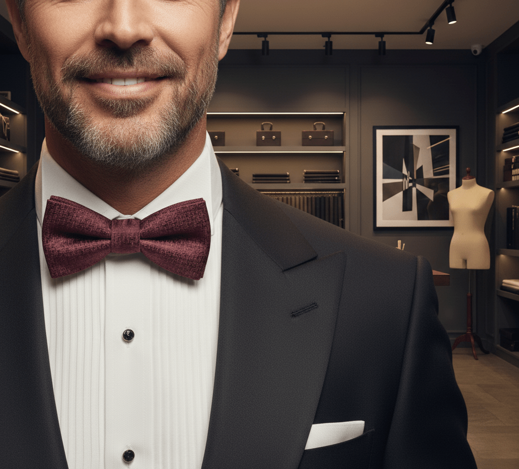 • Para una boda de noche, la corbata o pajarita dependen del código de vestimenta. Si el evento es de rigurosa etiqueta (esmoquin), la pajarita es obligatoria; si es traje oscuro, una corbata de seda en tonos profundos es una elección soberbia.